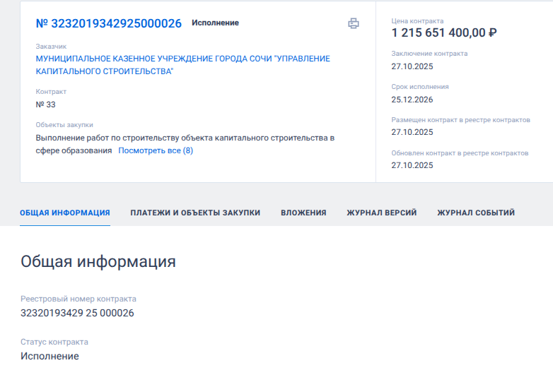 27 октября 2025 года управление капстроительства Сочи подмахнуло муниципальный контракт на 1,2 миллиарда рублей единственному участнику соответствующего аукциона. Другим-то застройщикам деньги явно не нужны.
