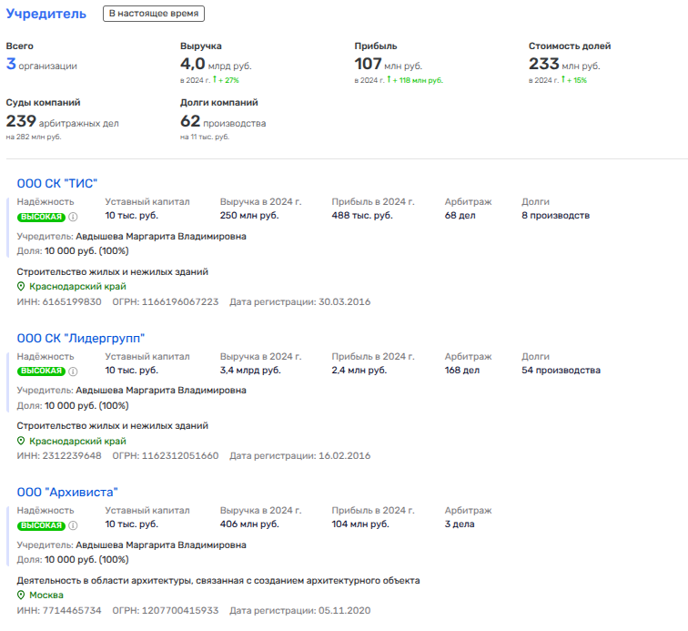 Юридическим владельцем ООО СК «ТИС» выступает некая Маргарита Авдышева, которой также принадлежит проектное ООО «Архивиста».