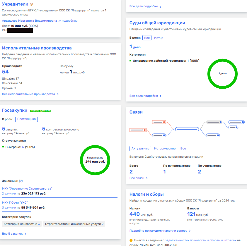 На неё же было переоформлено и ООО СК «Лидергрупп», наколотившее на госконтрактах почти 300 млн рублей. При этом последнее - еще один любимчик управления капстроительства Сочи и одновременно с этим фирма - должник по налогам на огромную сумму: на август 2025 года - 78 млн рублей.
