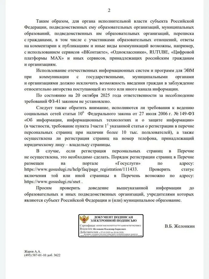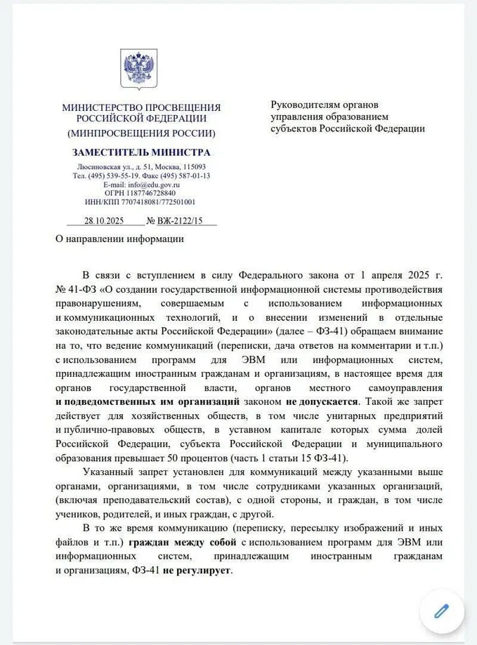 Официальные ответы от начальников, включая директоров обр. учреждений, надо получать только через отечественные приложения (пишет замминистра), но оно так и было. Через ТГ никто официально и не отвечал.