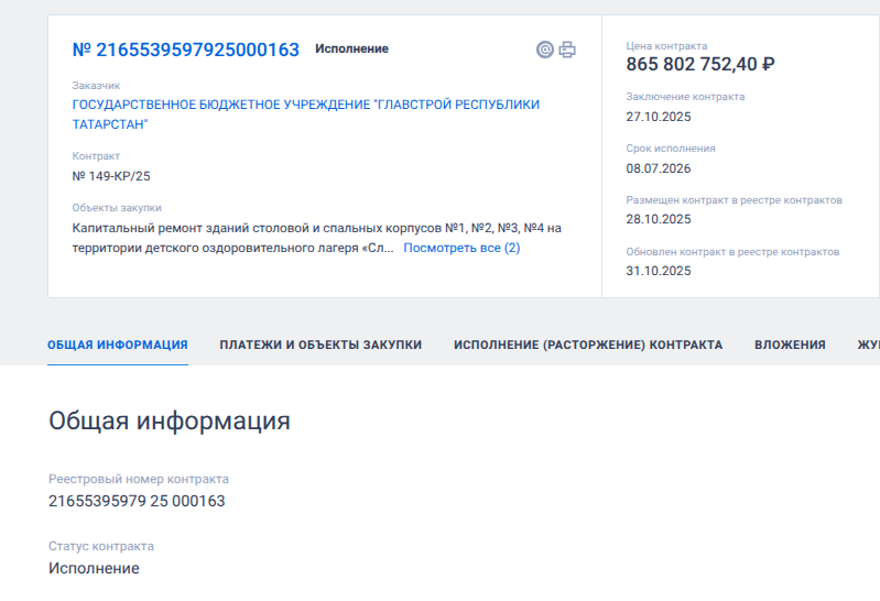 В конце октября 2025 года Главстрой Республики Татарстан подмахнул контракт почти на 866 млн рублей при авансе - почти 260 млн рублей. Речь идет о капитальном ремонте зданий столовой и спальных корпусов на территории детского оздоровительного лагеря «Следопыт» АНО «Татарстан – территория возможностей» в пос.Ильичевский Тукаевского района с покупкой мебели, оборудования, инвентаря и благоустройством территории. ОБ ЭТОМ СООБЩАЕТ MOSCOW STREETS