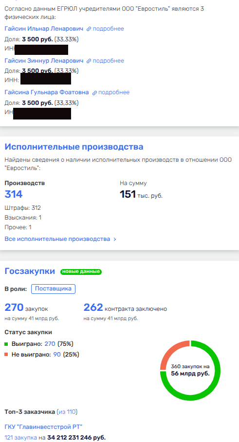Победителем признали ООО «Евростиль», которое нарубило на госконтрактах уже 41 млрд рублей, из которых 34 млрд обеспечило Главинвестстрой РТ (ГИСУ), а порядка 16 млрд - Главстрой. У этих двух ведомств с некоторых пор один и тот же директор - Ильдар Хафизов, который также возглавляет Фонд Благоустройства в РТ и был директором Татлизинга. Последний также весьма лоялен к ООО «Евростиль», обеспечил оному около 350 млн рублей.
