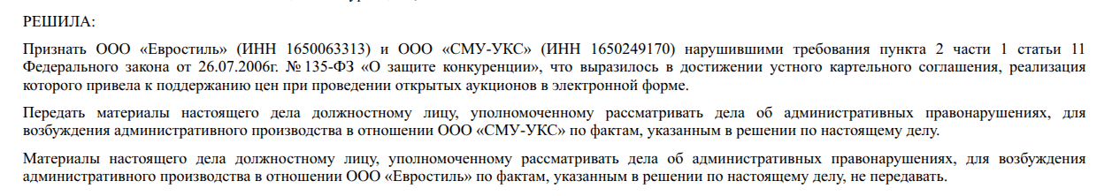 Так, в 2019 году УФАС возбудило административное дело о картельном сговоре между ООО «Евростиль» и ООО «СМУ-УКС». Речь шла о том, что в пяти аукционах ГИСУ в 2018 году победу «Евростиль», снижавший начальную цену на крохи (0,5%) получил не совсем законно. Дело в том, что второй участник, по мнению УФАС, был лишь ширмой для видимости конкуренции. В целом тогда фирма Гайсиных получила контрактов на более чем 1 млрд рублей.