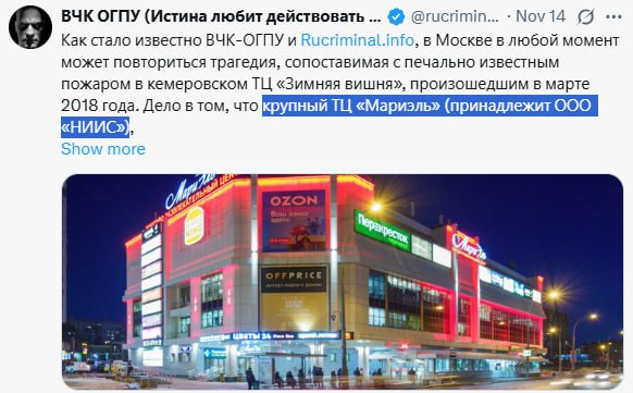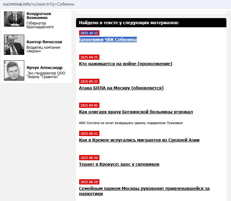 Тут самое интересное: Сергунина на себя блок поставила, а на мэра Москвы Сергея Собянина — нет. Его Шварев «клепал» постоянно. Последний пост на РУКРИМИНАЛ от 12 октября 2025 года получил название «Броневики ЧВК Собянина» (доказательства на скринах) (https://t.me/korobka_kserox/116740?single). Судя по всему, Сергунина репутационно подсиживает Собянина — кто знает, может, сама метит в кресло мэра.