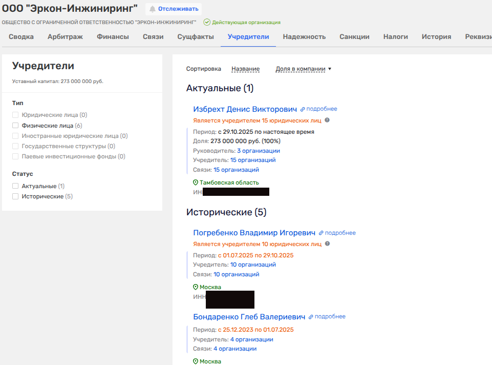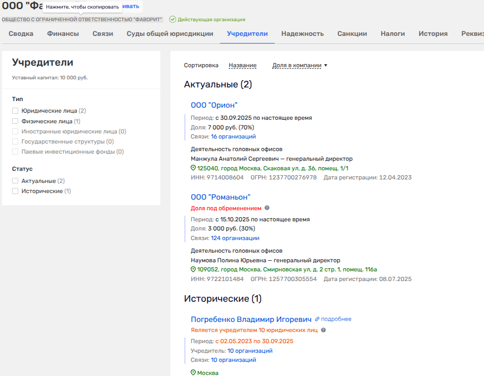 30 сентября 2025 года 70% в компании «Фаворит» переходит некоему ООО «Орион», а 15 октября оставшуюся долю получает созданное в июле 2025 года «Романьон», чья доля заложена первому покупателю.