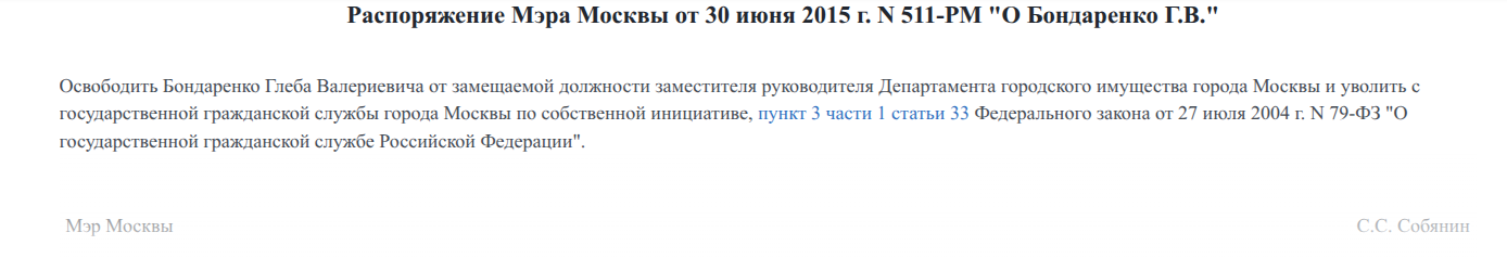 Бондаренко - тезка бывшего министра инвестиций и инноваций Московской области, экс-главы управления Сбербанка по работе с проблемными клиентами, а главное - бывшего замглавы департамента городского имущества Москвы. Его назначал лично Собянин в 2014 году, но уже через год уволил якобы по собственному желанию.