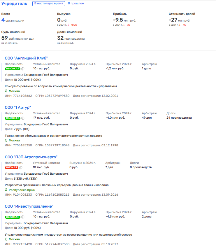 Уже в 2017 году Бондаренко стал фигурантом громкого скандала. Задержанный по делу полковника Захарченко глава "МИА-банка" Владимир Корьевкин дал показания на чиновника, якобы тот дал указание взять на работу отца полковника-коррупционера и платить ему зарплату, хотя тот числился в банке лишь номинально. Таким образом, было выведено 4 млн рублей. Чем закончилась история, не сообщалось, но из медиаповестки Бондаренко исчез. Чтобы спустя некоторое время всплыть как владелец целой пачки фирм, скупающих по сходной цене бывшие госактивы.