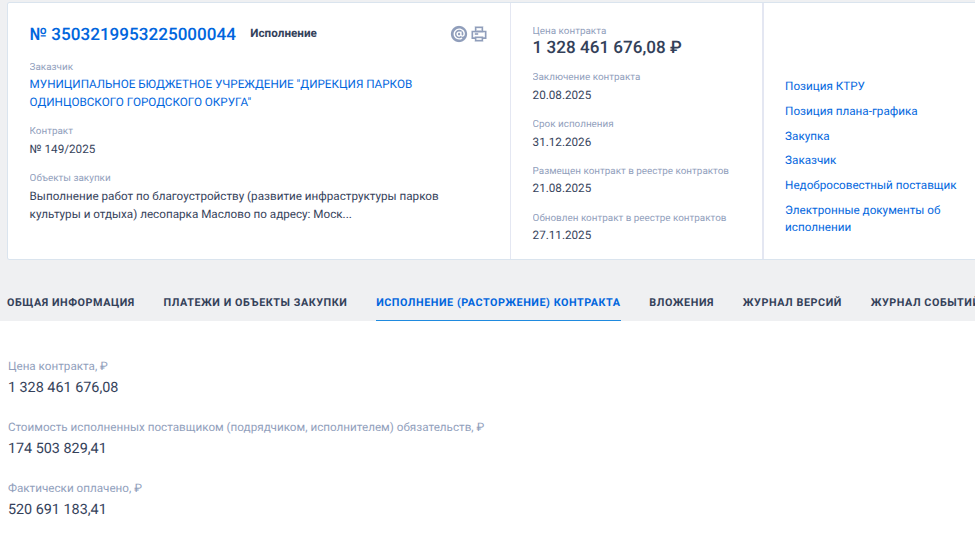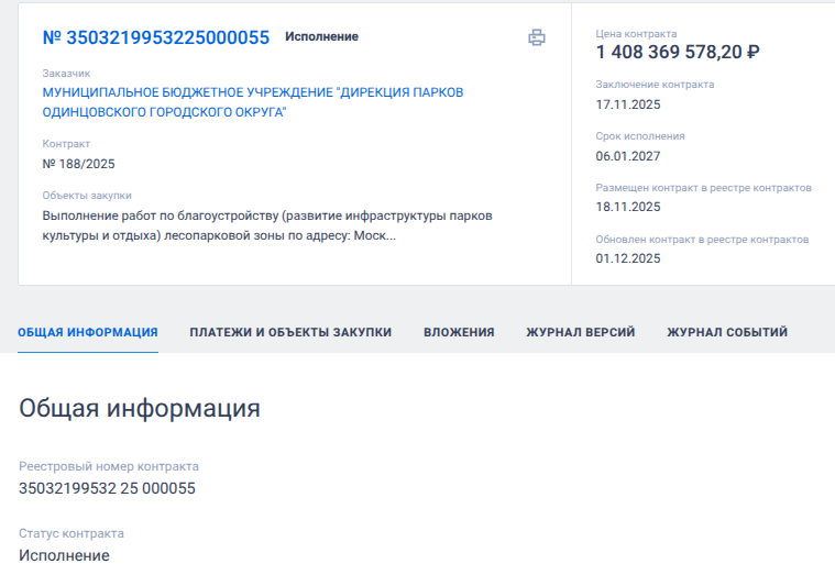 17 ноября 2025 года МБУ «Дирекция парков Одинцовского городского округа» подмахнуло контракт на 1,408 млрд рублей брянской фирме «ТСК ЭЛИТНЫЙ САД». Сразу же ей будет выплачен аванс на 422 млн рублей.