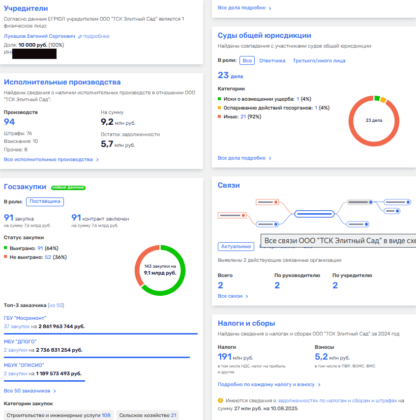 Полноводной рекой в фирму, которая имеет крупные налоговые долги, потекли госконтракты на миллиарды рублей. Заказчик прикинулся слепым и глухим, подмахивая ООО «ТСК ЭЛИТНЫЙ САД» контракт за контрактом. Ведь за владельцами, вписанными в ЕГРЮЛ, стоят люди советника губернатора Подмосковья Воробьева Года Нисанова и братья-олигархи Ротенберги.