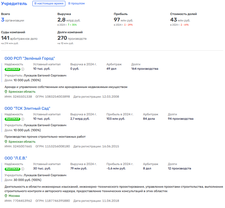 Владельцем фирмы является Евгений Лукашов, на которого также оформлены несколько компаний в Брянской области и Москве. При этом, если брянская фирма осваивает госконтракты столицы, то московская, наоборот, является держателем муниципальных земель в Брянской области.