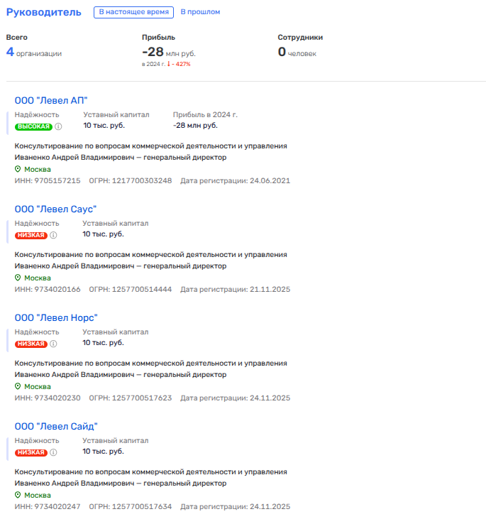 Подконтрольно оно ООО «Левел Групп» (90%), а еще 10% отстегнули директору Андрею Иваненко. Последний - директор целой пачки свеженаштампованных в конце ноября 2025 года новых юрлиц из дивизиона Level Group - «Левел Саус», «Левел Норс», «Левел Сайд», явно созданных для каких-то тендеров или ввода на площадку в Нижнем. Чистенькие активы, через которые можно вывести средства?