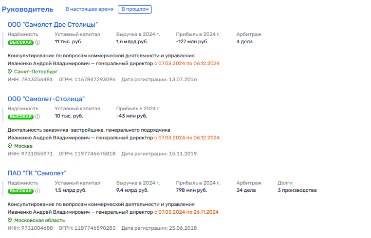 Иваненко же был директором ООО «Самолет Две Столицы» (тут долю имел Воробьев), ООО «Самолет-Столица» и ПАО ГК «Самолет».