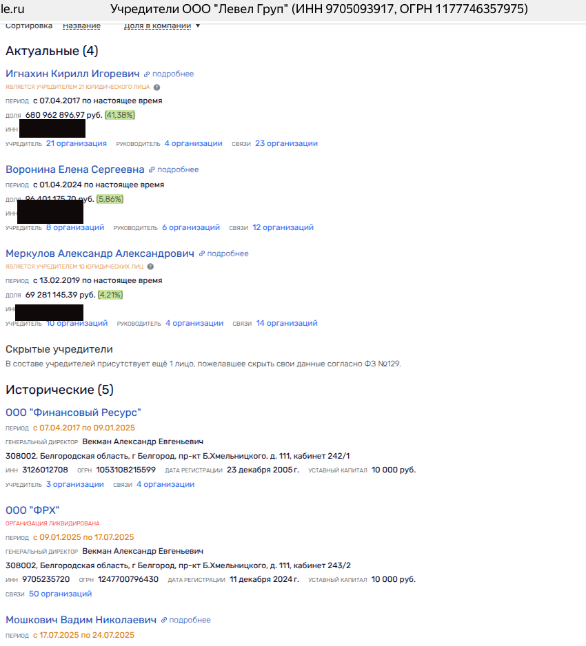 На сегодня владельцами ООО «Левел Групп» выступают четыре физлица - директор всего дивизиона Кирилл Игнахин, директор по девелопменту Level Group Александр Меркулов, еще один топ Елена Воронина и некое скрытое лицо. На самом деле то самое скрытое физлицо - это сам Мошкович, что с 24 июля 2025 года делает вид, что его нет среди владельцев. Ход, рассчитанный на невнимательных или идиотов?