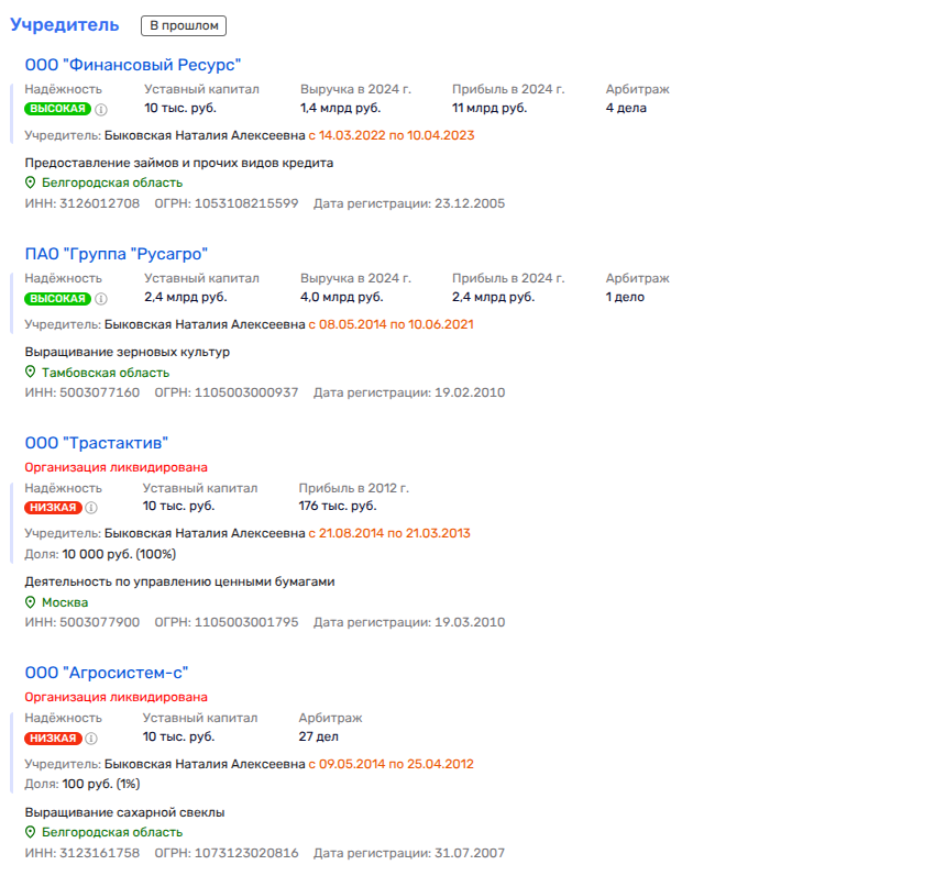 Помимо схемы с сокрытием и использованием доверенных лиц как прикрытия, в качестве ширмы-прикрытия олигарх использует и свою супругу Наталию Быковскую. Так, например, именно ей он в 2022 году передал фирму «Финансовый Ресурс», а спустя год в ЕГРЮЛ появилась запись, что владелец (та самая Быковская) скрыт.