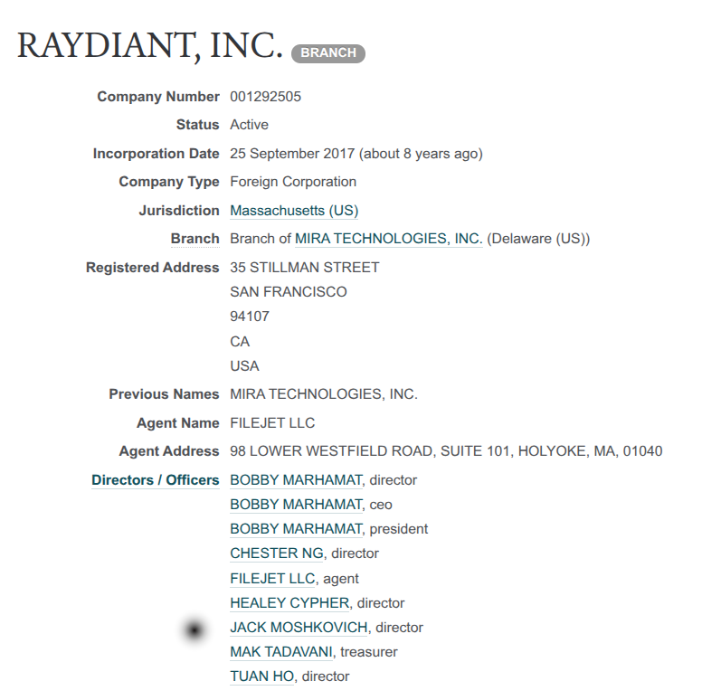 Так, например, Jack Moshkovich, предпочитающий использовать не родное русское Евгений, числится руководителем американской фирмый RAYDIANT, INC (ранее называлось MIRA TECHNOLOGIES, INC.).