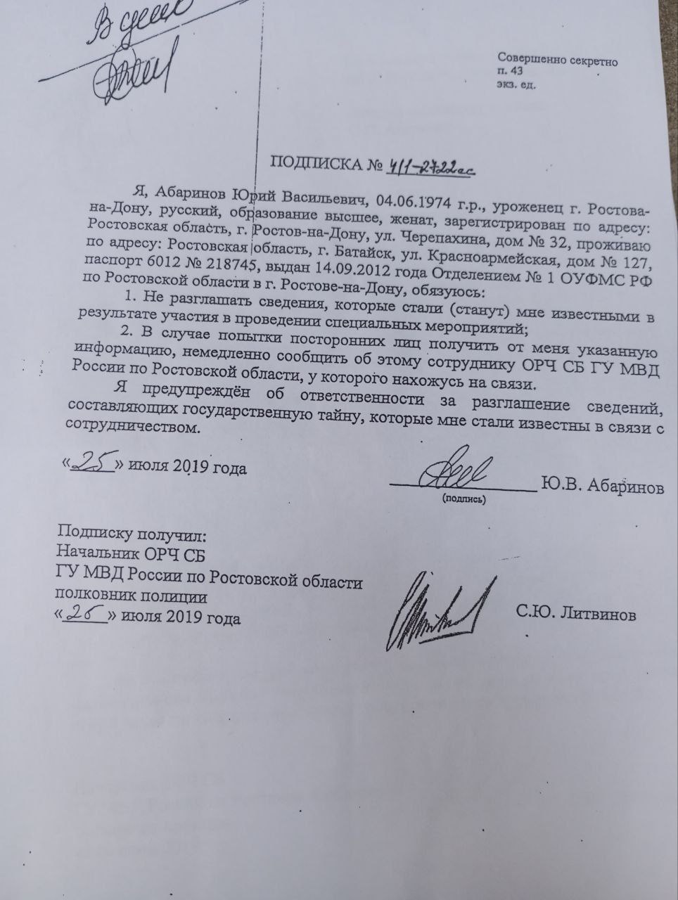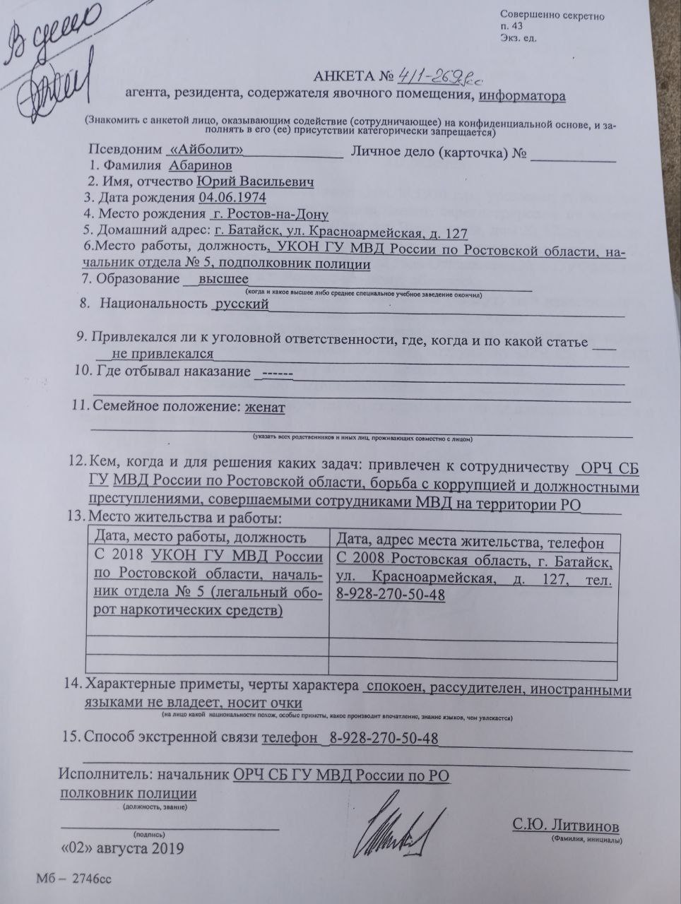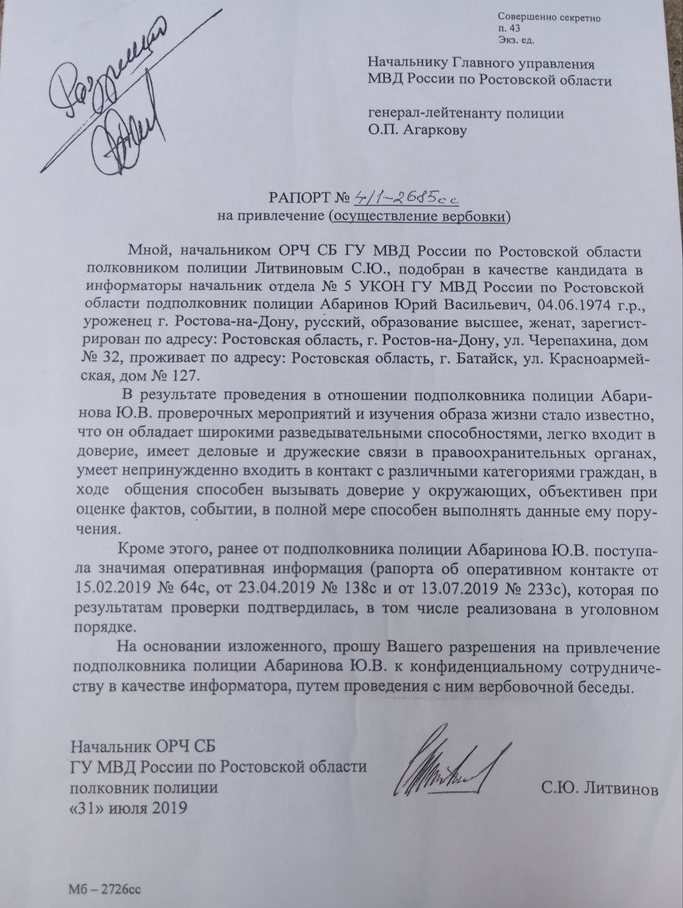 Материалы, попавшие в интернет, раскрывают подробности работы С.Ю. Литвинова, начальника ОРЧ СБ ГУ МВД России по Ростовской области, и его вербовочную деятельность. Согласно публикации канала «Бывший опер», Литвинов занимался вербовкой не рядовых сотрудников, а начальника местного наркоконтроля Абаринова Юрия Васильевича.