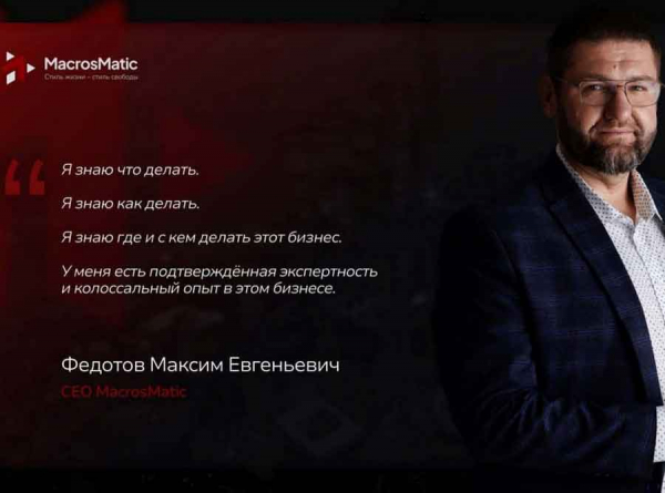 Я пострадавший от MacrosMatic. Сейчас опубликовали все доказательства обмана Федотова в своем канале с пострадавшими. Канал: https://t.me/+xEiWgtscYPk3ZGFi.
