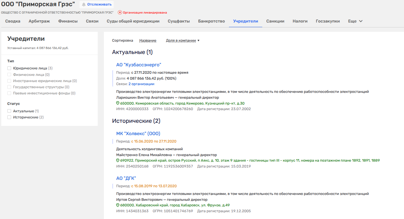 В июне 2020 года среди владельцев ООО «Приморская Грэс» появляется некое МК «Холвекс» (бывшее кипрская Donalink Ltd), прописанное в русском офшоре на о.Русском. При этом за структуркой, что до АО «Кузбассэнерго» пробыла владельцем ГРЭС лишь пять месяцев, стояли кипрские АИМ КАПИТАЛ ПИЭЛСИ и ЛИНЕА (СИ-УАИ) ЛТД.