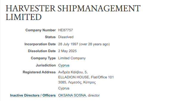 OKSANA SOSNA была также директором кипрской HARVESTER SHIPMANAGEMENT LIMITED, ликвидированной лишь в мае 2025 года. Не через нее ли капиталы уплывали из России?