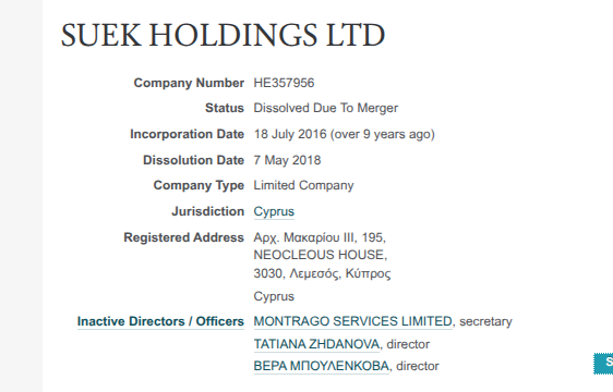 В анамнезе наследили всё та же кипрская АИМ КАПИТАЛ СИ, а также SIBERIAN ENERGY INVESTMENTS LTD. Последнее ликвидировано в 2018 году, вот только там засветился некий MAXIM STREKNEV - секретарь другой кипрской кубышки, MADAKE ENTERPRISES COMPANY LIMITED, ликвидированной лишь в 2021 году, директором коего была некая ΒΕΡΑ ΜΠΟΥΛΕΝΚΟΒΑ. Последняя также была директором кипрской SUEK HOLDINGS LTD (с коим связано и кипрское SUEK ASSETS HOLDINGS LIMITED), а СУЭК - это актив Мельниченко. То есть и вся паутина кипрских юрлиц может быть связана именно с ним.