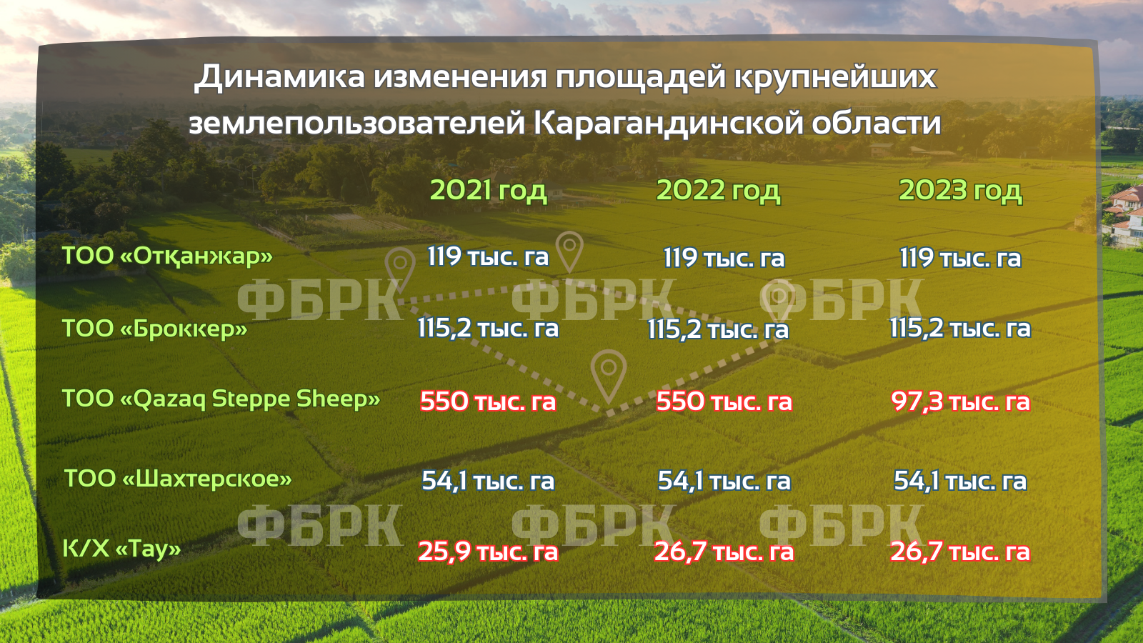 Редакция ФБРК продолжает анализировать динамику крупнейших землепользователей Казахстана с целью выяснить, какое количество сельскохозяйственных земель было изъято у них за последнее время.