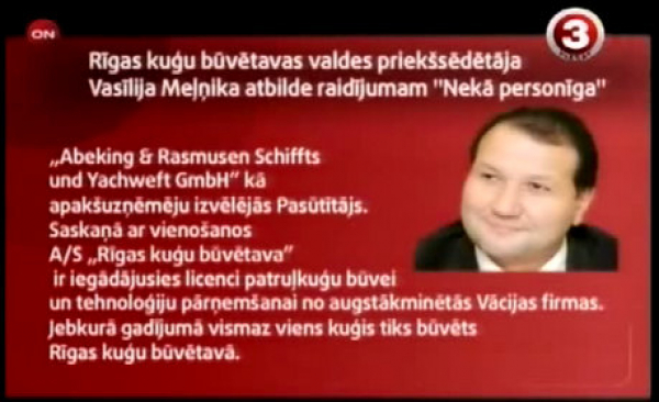 Телепередача Nekā Personīgā (TV3) сообщает, что принадлежащая В. Мельнику Rīgas kuģu būvētava получила заказ на строительство пяти военных кораблей ещё два года назад. Сейчас выясняется, что, как минимум, три корабля будут построены не у Мельника, а на судоверфи в Германии.