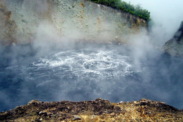 Это озеро — геотермальный феномен. Оно образовалось в кратере фумаролы — естественного «дымохода», через который вулкан выпускает газы и перегретый пар. Под ним находится магматический очаг, расположенный близко к поверхности.