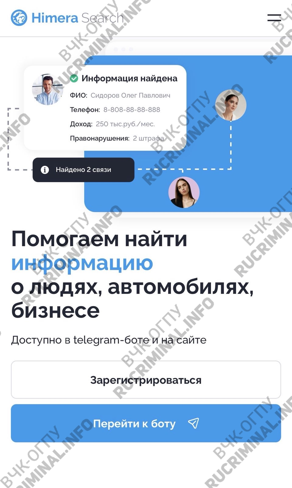 ВЧК-ОГПУ и Rucriminal.info нашли владельца и разработчиков главного монополиста рынка пробивов (торговли персональными данными россиян) — проекта Himera Search. Проект тесно связан с силовиками – среди совладельцев два бывших сотрудника МВД, брат одного из них работает в ФСБ РФ. Himera Search оказывает незаконные услуги по пробиву, открыто работает, как в Телеграм, так и вообще в России и ряде стран СНГ (даже по официальным договорам) пока других игроков зачищают. А его владельцы спокойно посещают РФ и расширяют бизнес.