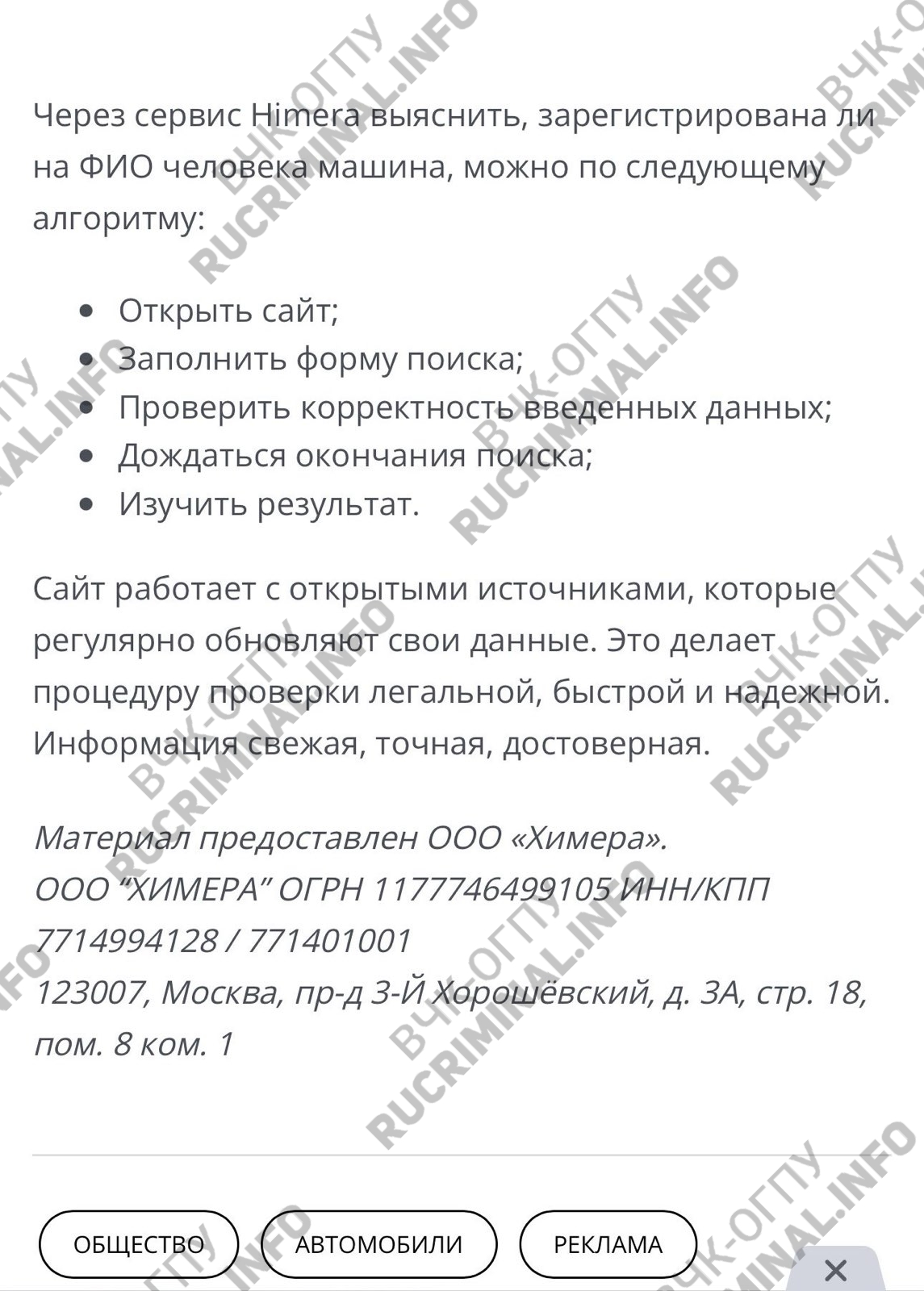 На главном сайте Himera Search можно найти ещё один вариант пользовательского соглашения, где в качестве оператора вместо киргизского ОсОО «Транстрейд» указана армянская компания LLC «Orgsafe». И за этой ширмой был спрятан ещё один сайт по пробиву.