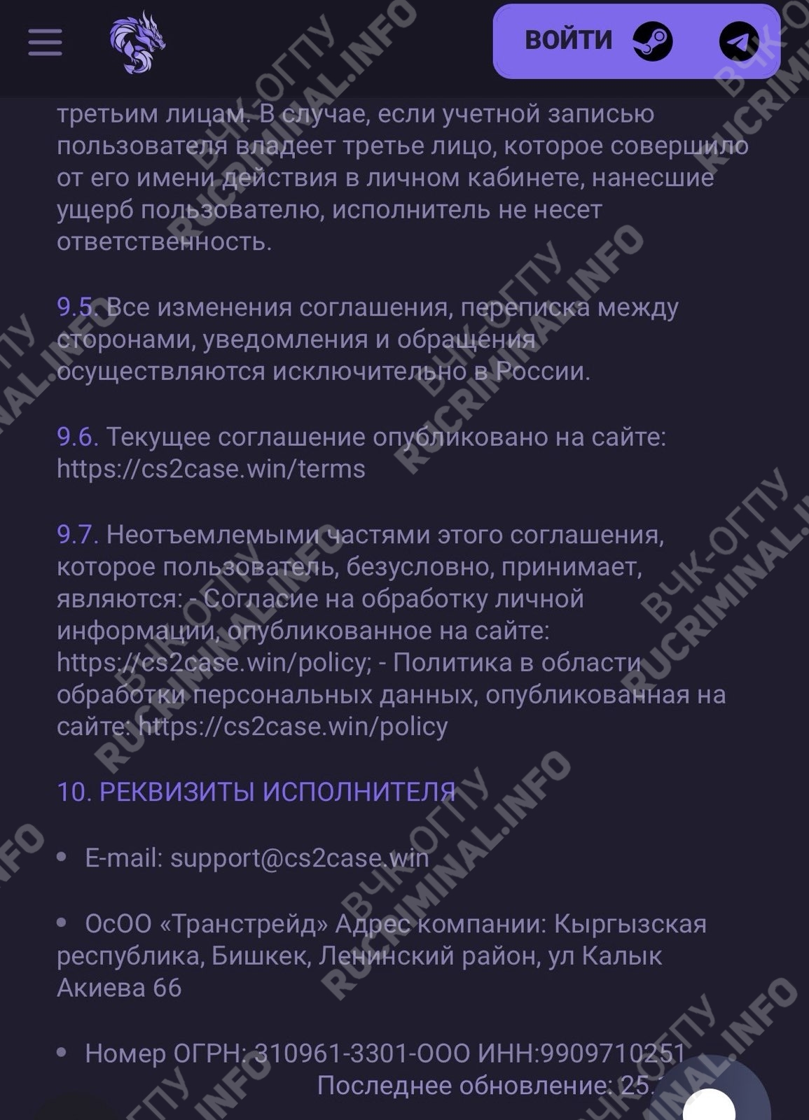 Примечательно, что от лица ОсОО «Транстрейд» работают ещё минимум три сайта непрофильного толка. Это CS2CASE.WIN, CS2CASE.IO и VACASE.ME где торгуются скины к популярным играм CS и Valoran. Но это кибер-подспорье явно не основное направление деятельности команды проекта.