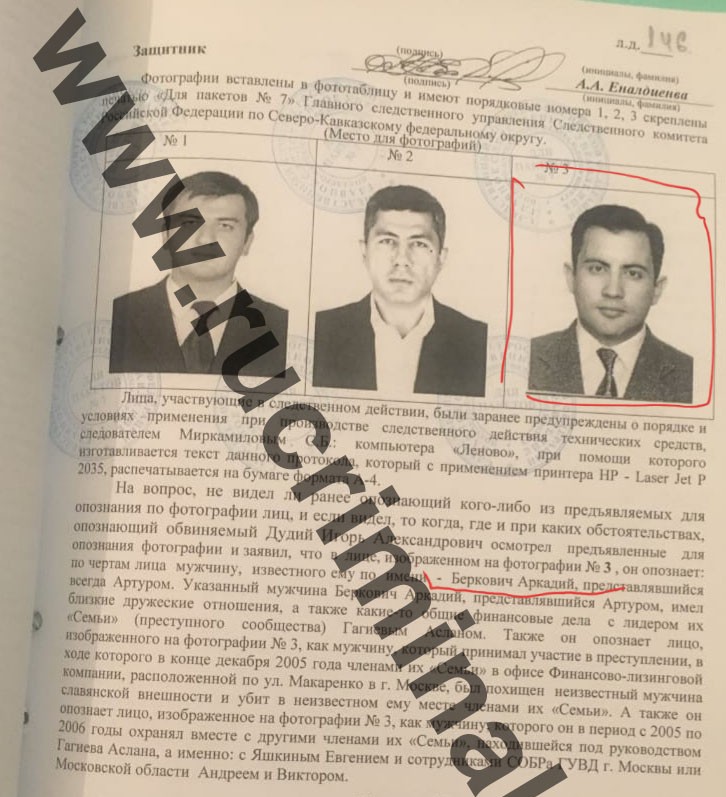 The leader of the hitman gang, Aslan Gagiev (Dzhako), who committed over 60 murders, had clients and partners at the very top. Investigators have documents and testimony to prove this. In particular, Gagiev worked very closely with Arkady Berkovich (aka Artur Khabibullin). Berkovich was responsible for all financial and banking matters under Dzhako.