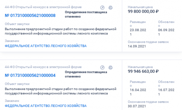 Первые торги были сорваны, так как некое "Энвижн груп" сбило цену до одного рубля, а Рослесхоз заявил, что за рубль не реально что-то создать, и начал готовить новые торги.